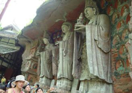 Midway around the site, visitors come upon a 20-meter-long Reclining Buddha inset into the cliff face, fronted by realistic portraits of important donors. The following two panels, Parental Kindness and Sakyamuni’s Filial Piety, interestingly use Buddhist themes to illustrate Confucian morals. Next is the Eighteen Layers of Hell, a horrific scene interspersed with amusing images like the Hen Wife and the Drunkard and His Mother. The final panel illustrates the life of Liu Benzun, a Tang-dynasty ascetic from Leshan showing strong Tantric influence. |